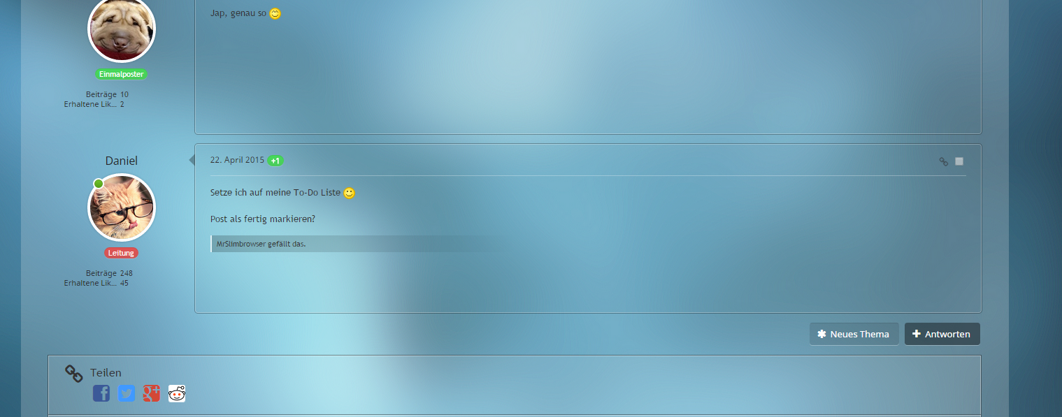 - Button "Neues Thema erstellen" in einem gerade geöffneten Thema ist m. M. entweder zu viel oder ungünstig weil er, zumindest von mir, zuerst bemerkt und angeklickt wurde als der Button "Antworten" (Antworten hätte mir in meinem Fall gereicht, wäre fast ein neues Thema geworden) :meinung: