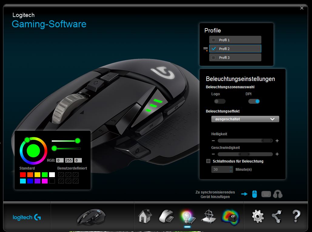 Bei der Beleuchtung lassen sich die DPI Beleuchtung und die des Logo auch in 3 Profilen separat zuweisen.
