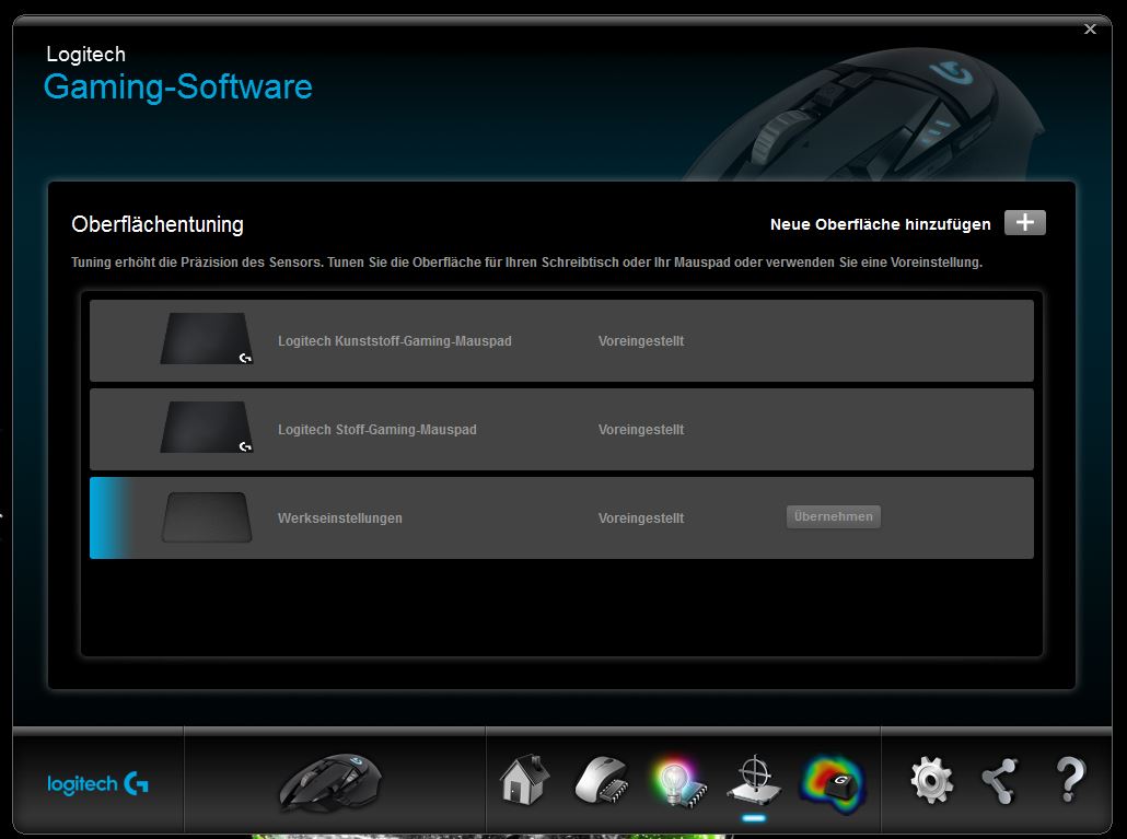 Schließlich kann man noch die Unterlage der Maus auswählen, je nachdem auf welchem Untergrund die Maus genutzt wird.