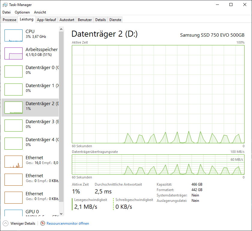 Ein Blick in den Taskmanager offenbarte, dass der Stick sich gerne mal ein paar Pausen gönnt, während meine SSD sich ziemlich langweilte.