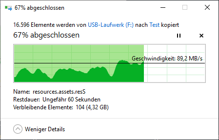 Danach habe ich den Ordner selbstverständlich auch wieder zurück auf die SSD geschoben und konnte zumindest bei größeren Dateien Geschwindigkeiten von bis zu 103MB/s erziehlen!