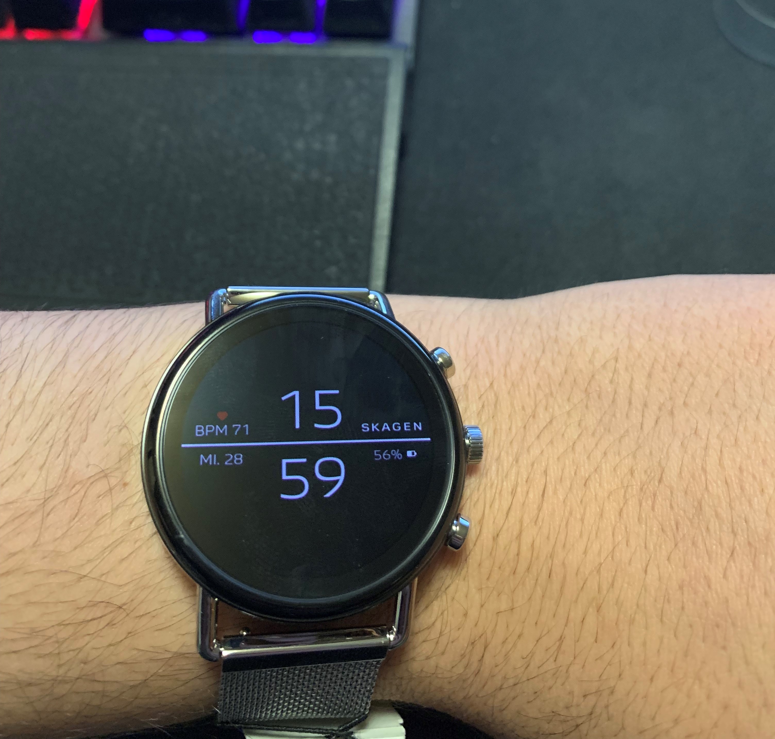 Die Skagen Falster 2, die ich auch länger in Benutzung hatte, bietet im Gegensatz zur „normalen“ Uhr ein rundes OLED-Panel. Das zeigt z.B. viel Nützliches an: z.B. eingehende Nachrichten, auf welche man sofort antworten kann oder die Überwachung des Schlafs, ebenso ist ein Pulsmesser, der zwar weniger akkurat als der der Apple Watch ist, an Board. Ein NFC-Chip macht Bezahlen per Google Pay möglich. Dennoch muss ich für einige Funktionen noch mein Smartphone aus der Tasche ziehen.