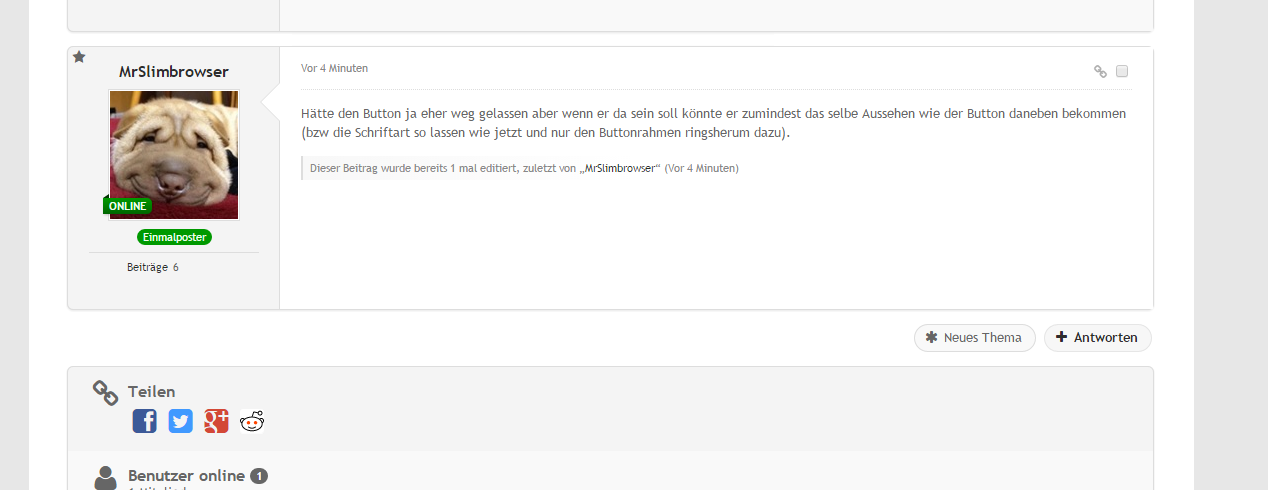 Button "Neues Thema erstellen" in einem gerade geöffneten Thema ist m. M. entweder zu viel oder ungünstig weil er, zumindest von mir, zuerst bemerkt und angeklickt wurde als der Button "Antworten" (Antworten hätte mir in meinem Fall gereicht, wäre fast ein neues Thema geworden)