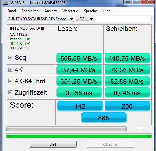 Die Lese- und Schreibraten sind echt überragend. 505 MB/s Lesen, 440MB/s schreiben ist schon sehr ordentlich. Die Zugriffszeiten sind auch echt top.