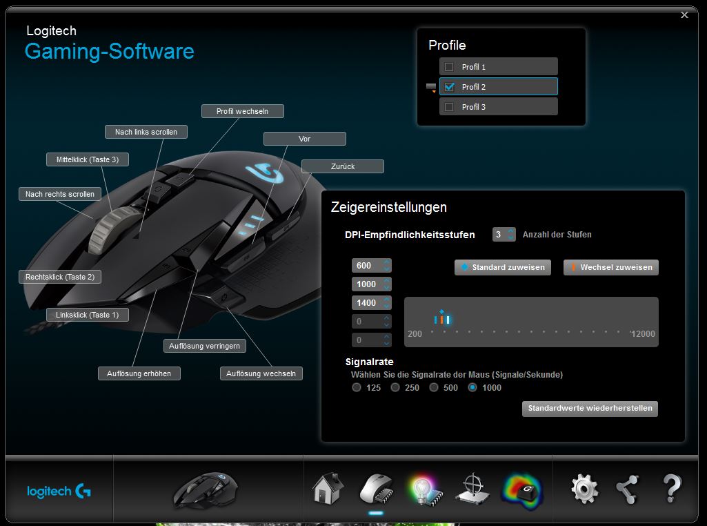 Für die Tasten gibt es viele Möglichkeiten. 3 Profile kann man sich anlegen.